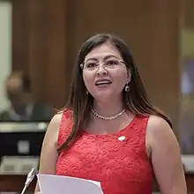 In November 2021 she was one of the politicians who abstained which allowed the Economic Development and Fiscal Sustainability Law to be passed.[9] She also proposed, in the National Assembly, that 15 November should be set aside as a day to remember worker's struggle on the anniversary of the 1922 Guayaquil general strike and massacre.[10]
