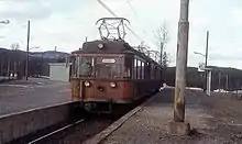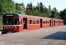 During the 1980s, the city decided to connect the four suburban lines west of the city center with the Oslo Metro. The Sognsvann Line was selected as the first line to be upgraded, so the two systems would become compatible. The line was upgraded to metro standard by replacing the overhead wire with a third-rail power supply and installing automatic train protection. For Sognsvann this also meant that the single track was replaced with a double track.[2] From 4 April 1993 trains along the Sognsvann Line were connected to the eastern part of the metro, initially connected with the Østensjø Line.[3]