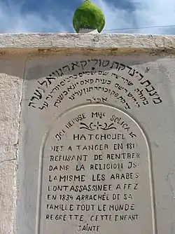 Her headstone has inscriptions in both Hebrew and French. The French text reads, "Here rests Mademoiselle Solica Hachuel born in Tangier in 1817 refusing to enter into [or 're-enter'; the French text reads rentrer] the Islamic religion. The Arabs murdered her in 1834 in Fez, while she was torn away from her family. The entire world mourns this saintly child."[15]