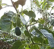 The fruits are edible and have a pleasant acidulous taste.[4] The plant produces some of the largest fruits known in section Pachyphylla. The fruit pulp of some trees is sweet, juicy, and pleasant-tasting,[5] and in others it is acidulous, and without any sweetness.[6] A purplish layer of soft pulp surrounds the seeds. Fruits ripen slowly, but once ripe their shelf life is longer than that of the tamarillo. Although a good candidate for trial as a fruit crop, it may be difficult to successfully cultivate this species outside the specialized climate of southern Colombia where it is native.[5] In New Zealand, it was noted that trees cultivated in semi-shade set large crops of fruit, but plants grown in full sun performed very poorly. The trees were somewhat subject to branch die-back on fruiting branches.[6]