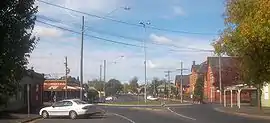 At the southern end of the suburb is the Ballarat railway station, the busiest in urban Ballarat. According to the 2011 Census, 4% of people commute by train (four times the Ballarat average and an increase of 100% since the 2006 Census).[6] Growth in train travel is facilitated by major rail improvements. Soldiers Hill benefits from the trend toward intercity commuting in being the closest residential area to Ballarat station. An important part of Ballarat's strong railway history, Soldiers Hill is home to its main railway complex as well as the Ballarat North Workshops, a major railway systems engineering facility. A number of historically used industrial branch lines serviced light industry in the 1880s, which was located along Creswick Road. The 1888 signal box at Macarthur Street (demolished due to vandalism in 2012),[7] although platformless, was once staffed and was a drop-off and pick up point for trains used historically by students of Macarthur Street Primary. A tramway (demolished in the 1970s) once ran the length of Lydiard Street Nth with several stops in Soldiers Hill along the way.[8]