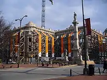 Traffic passed around all four sides of the monument until the 1970s. A new traffic pattern was devised for Penn Square and the monument in 1972.[1] A brick plaza was constructed in tandem with the expansion of the nearby Fulton Bank building, closing off traffic on the monument's northeast corner and opening it to pedestrians.[2] The size of the monument's base was shrunk from its original 35 feet (11 m) down to 17 feet (5.2 m) as part of the reroute of traffic.[1] The iron railing, added in 1877, was removed and new granite curbing was added to protect the monument from traffic collisions.[1]