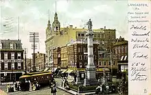The Soldiers and Sailors Monument also stands on the exact spot where the Second Continental Congress met during the American Revolutionary War on September 27, 1777, in the old Lancaster Courthouse.[2] The courthouse was built in 1739 but later burned down in 1784, rebuilt 1787 to serve as State House from 1799 to 1812 and reverting as Lancaster County Courthouse until 1852.[4]