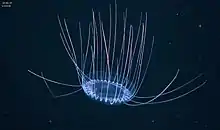 Solmissus, or dinner plate jellyfish, is a genus of hydrozoans. Its species are unique among cnidarians in that they actively hunt for prey as opposed to passively waiting for plankton to pass by. They are found in the deep waters of Monterey Bay, California. They are most likely to be found in the deep sea, mid water (700โ€“1,000 m (2,300โ€“3,300 ft)). They grow to be 20 cm (7.9 in) in diameter. These hydrozoans feed on gelatinous zooplankton, including salps and doliolids, ctenophores, jellyfish, and copepods. However, Solmissus may be limited to feeding on soft-bodied prey by the type of nematocysts on their tentacles (Mills).