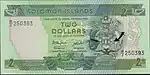 On 24 October 1977 banknotes were introduced in denominations of 2, 5 and 10 dollars, with 20 dollar notes added on 24 October 1980.[1] The first issues of banknotes depicted Queen Elizabeth II. However, all series issued later had the national crest instead. 50 dollar notes were introduced in 1986, followed by 100 dollar notes in 2006.[2] A polymer two dollar banknote was issued in 2001 to replace the cotton fibre issue, but the banknote reverted to cotton in the 2006 series.