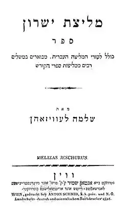 - Melitsat Yeshurun [The Eloquence of Jeshurun] (in Hebrew). Vienna: A. Schmid. 1816. hdl:2027/hvd.hwnlzx.