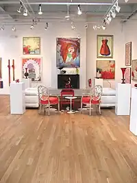 Abstract and representational artwork in all visual disciplines was on display in the gallery's 9,600-square-foot (890 m2) setting. Somerhill featured fine art glass and jewelry, a contemporary photography gallery, an open-air glass atrium which stood at the center of the main salon where featured exhibitions were shown. The gallery also featured white oak floors, fabric walls and over 40 skylights.