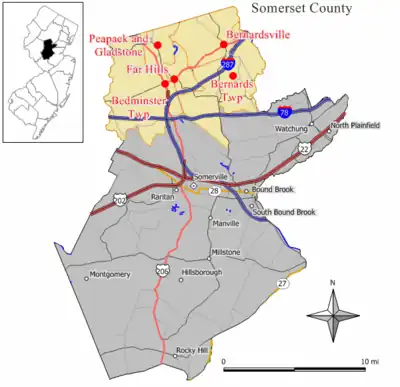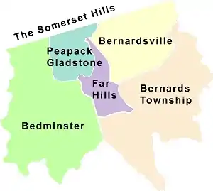 The Somerset Hills is known as the northern region of Somerset County located in the U.S. state of New Jersey and includes the municipalities of Bedminster, Bernardsville, Bernards Township, Far Hills, and Peapack-Gladstone.[1] The Morris County municipalities of the Chesters (Borough and Township) and the Mendhams (Borough and Township) are periodically recognized as part of the Somerset Hills.[2][3]