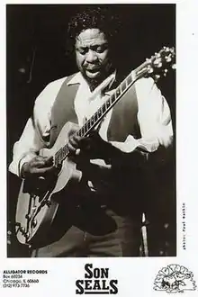 Seals was born in Osceola, Arkansas, where his father, Jim "Son" Seals, owned a small juke joint, called the Dipsy Doodle Club. He began performing professionally by the age of 13, first as a drummer with Robert Nighthawk and later as a guitarist.[4] At age 16, he began to play at the T-99, a local upper-echelon club,[5] with his brother-in-law Walter "Little Walter" Jefferson. He played there with prominent blues musicians, including Albert King, Rufus Thomas, Bobby Bland, Junior Parker, and Rosco Gordon. Their varying styles contributed to the development of Seals's own playing techniques. While playing at the T-99, he was also introduced to country-western music by Jimmy Grubbs, who occasionally asked Seals to play the drums or guitar with his group. At the age of 19, Seals formed his own band, Son Seals and the Upsetters, to fill in at the Rebel Club, in Osceola.[6] The band members were Johnny Moore ("Old Man Horse") on piano; Alvin Goodberry on drums, guitar, bass, or piano; Little Bob Robinson on vocals; and Walter Lee "Skinny Dynamo" Harris on piano. Shortly thereafter, a man from Little Rock, Arkansas, came to find "Little Walter" for a gig at his club, but when Walter turned it down the offer went to Seals.[7]