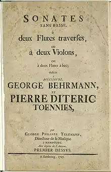 The title of the original print of Georg Philipp Telemann's Sonates sans basse for two traversos, violins, or recorders (TWV 40:101–106), first published in Hamburg in 1727, reads: "Sonates sans basse à deux Flutes traverses, ou à deux Violons, ou à deux Flutes à bec."[1] The collection was reprinted in Amsterdam (Le Cène, 1729), Paris (Le Clerc, 1736–37), and London (Walsh, 1746).[2]