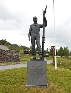 The movie, Frikaren på ski – The history of Sondre Norheim, the Father of Modern Ski Sport was produced by NRK in 1970. [7] In 1984, Norheim was inducted into the Scandinavian-American Hall of Fame as the first class of inductees. A statue of Sondre Norheim by Norwegian sculptor Knut Skinnarland (1909-1993) was unveiled in 1987 in the Scandinavian Heritage Park, in Minot, North Dakota. During 1988, an identical statue was unveiled in Morgedal, Norway by King Olav V. During 1993, the Sondre Norheim Eternal Flame Monument was added to the Scandinavian Heritage Park. Lars Berge Haugan, a skier representing Morgedal, lit the flame.[8]