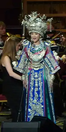 ![]() Song Zuying singing Dragon Boat Melody (龙船调) in Miao costume at the East Meets West concert at the Royal Albert Hall, London in June 2012. | |