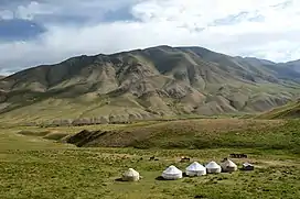 Songköl Too (Kyrgyz: Соңкөл тоосу) is a range in the Internal Tien-Shan that arcuately frames Songköl Valley from the north and separates Songköl Valley with Song Kol Lake from Jumgal Valley, and Telek Valley. It is located in Jumgal and Kochkor districts of Naryn Region. The length of the range is 92 kilometres (57 mi), and width up to 9 kilometres (5.6 mi). Average altitudes are 3,560 metres (11,680 ft) and the maximum altitude - 3,856 metres (12,651 ft). Difference in elevation between Songköl Too and Songköl Valley - 500–600 metres (1,600–2,000 ft), and between Songköl Too and Jumgal Valley - 1,400–1,600 metres (4,600–5,200 ft). Picks are gentle in the western part of the range and rocky - in the eastern. The northern slopes are steep and sharply rugged, and southern ones are gentle. The range is composed by majorly limestone.[1] [2]