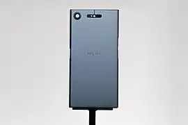 Sony refreshes the trademark Xperia Loop Surface design for the Xperia XZ1. But instead of using glass surfaces like the Xperia XZ Premium, the XZ1 is mostly consisted of a wraparound metal chassis, making up the back and sides of the device, with subtly-curved nylon top and bottom edges giving a more smoother approach to the overall design. The most defining change in the XZ1 as well as the XZ Premium is the placement of the image sensors at the back. It is now arranged across the camera lens, centered along the top, as opposed to being longitudinally placed below the lens like on the XZs. But unlike the XZ Premium which has a glass back panel, on the XZ1, the NFC antenna is housed alongside the image sensors, placed directly at the center of the glass window. A durable scratch-resistant glass panel made of Corning's Gorilla Glass 5[4] adorns the front of the device. Dual front-firing stereo speakers with Sony's new S-Force Front Surround stereo, producing 50% more sound pressure than previous Xperia models for a more immersive surround sound, along with a 13 MP front camera, ambient light and proximity sensor and a notification LED make up the Xperia XZ1's front panel.
