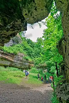 During renewed excavations in 1905 and 1906, a large number of remains of cave bears, cave lions, and hyenas were again found.[12] The total length of the cave, including the outer cave, was redetermined in 1966 by the Nuremberg Natural History Society to be 465 meters.[12] In 1971, the carbide lamps previously used in guided tours were replaced by electric lighting.[17] In the 1970s, the Hösch Cave, which had been closed and cut off during development work in 1833, was rediscovered. In 1997, the entire cave had to be remeasured again, as further discoveries were made in the course of more recent research work by speleologists from Bayreuth and Nuremberg. The new survey, together with the Hösch Cave, resulted in a length of about 900 meters.[2] In late summer of 2000, the show cave operation, with 34,000 visitors a year at last count, was discontinued due to safety deficiencies.