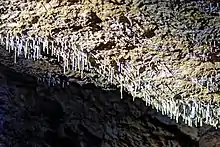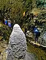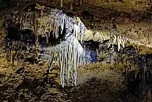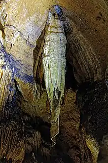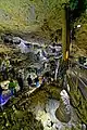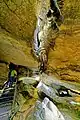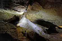 The path leads through a very narrow passage about three meters long to a platform in the upper part of the first section of the cave. Directly in front of the path, which leads there to the left, is the "Elephant's Ear", a free-hanging sinter plume more than one meter long. As a counterpart, a stalagmite has formed at the bottom, the "Beehive". The path then passes the "Oriental City" and turns right in a semicircle. The "Oriental City" is located halfway up on the left in a small cavity and consists of numerous candle stalagmites. Afterwards a staircase leads more than ten meters down, where a cave bear of the small cave bear race Ursus spelaeus eremus,[20] assembled from bones, can be found. The sintering on the right wall reminds of a waterfall and gave reason to give the formation the same name. On the ceiling there are sinter flags, sporadically also sinter tubes. On the floor there are prehistoric and protohistoric bones covered with sinter mass, especially reindeer antler poles and a mammoth basin deposited in one place by the Cromagnon people of the Gravettian, probably in a shamanic context in the cave. Stalagmites with drop funnels have also formed in several places.