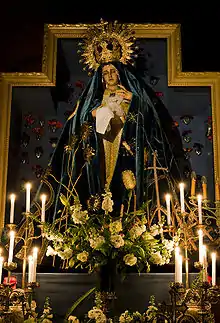 | Attributes | Statue of Our Lady of Sorrows holding a white handkerchief, gold crown and jewelry, richly embroidered mantle |