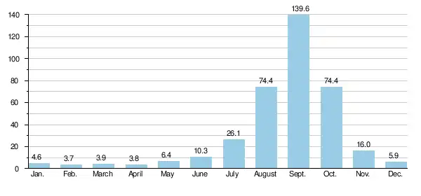 There is everywhere a large surplus rainfall from July to September (boreal summer), giving rise to violent floods, but the deficit is a severe dry season from December to April.[2]