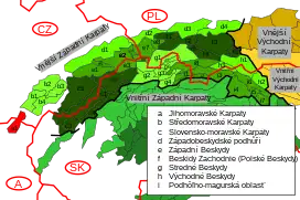![]() South-Moravian Carpathians (marked in red) within the Outer Western Carpathians