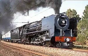 The Class 15F 4-8-2 Mountain type steam locomotive was designed by W.A.J. Day, Chief Mechanical Engineer (CME) of the South African Railways (SAR) from 1936 to 1939, based on the design of the Class 15E by his predecessor, Allan Griffiths Watson, and later modified again by his successor, M.M. Loubser. It was built in five batches by four locomotive manufacturers in Germany and the United Kingdom over a period of ten years spanning World War II.[2][4]
