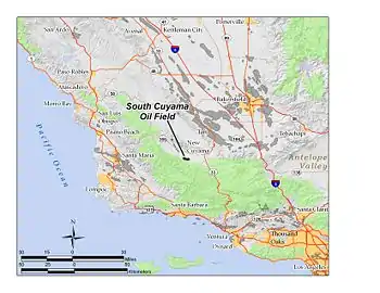The South Cuyama Oil Field is a large oil and gas field in the Cuyama Valley and the adjacent northern foothills of the Sierra Madre Mountains in northeastern Santa Barbara County, California. Discovered in 1949, and with a cumulative production of around 225 million barrels (35,800,000 m3) of oil, it ranks 27th in size in the state, but is believed to retain only approximately two percent of its original oil (approximately 4.6 million barrels (730,000 m3)), according to the official estimates of the California Department of Oil, Gas, and Geothermal Resources (DOGGR). Of the top forty onshore oil fields in California, it is the most recent to be discovered, but by the end of 2008 only 87 wells remained in production.[1]
