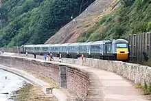 The South Devon Railway was amalgamated into the Great Western Railway on 1 February 1876[3] and the gauge converted to the standard 4 feet 8½ inches after 20 May 1892.[4] A station was opened to serve Dawlish Warren in 1905,[5] all the other stations on the sea wall having opened with the line in 1846.