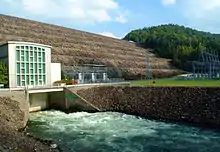 South Holston Dam is a hydroelectric and flood control dam on the South Fork Holston River in Sullivan County, in the U.S. state of Tennessee. It is the uppermost of three dams on the South Fork Holston owned and operated by the Tennessee Valley Authority, which built the dam in the 1940s as part of efforts to control flooding in the Tennessee River watershed. On October 21, 1950 the valve gate closed and water began backing up to create South Holston Reservoir. Work began on the dam in December 1941, but in November 1942, the War Production Board requested that the operation be suspended because of a shortage of critical materials. Work did not resume until July 1, 1947. The dam now impounds the South Holston Lake of 7,550 acres (3,060 ha), which extends northeastward across the Tennessee-Virginia state line.[3]