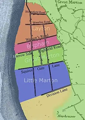 The Hawes was split into four distinct areas representing the main townships of the freeholders – Layton with Warbreck, Bispham, Great Marton and Little Marton.[3]