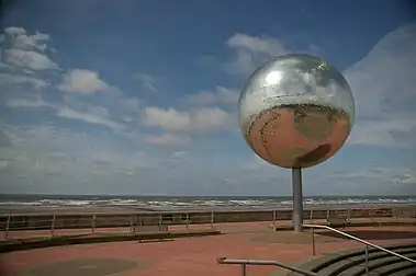 Alluding to the town's ballroom culture, They Shoot Horses, Don’t They is an artwork by Michael Trainor that was installed on South Promenade in October 2002. At six metres in diameter and weighing six tonnes it was the world’s largest dance hall mirror ball at the time, covered in 47,000 mirrors that gently rotate and catch the light.[74] The mirror ball was one of ten public artworks on South Promenade called The Great Promenade Show, installed between 2001 and 2005.[75] Blackpool's High Tide Organ by Liam Curtin and John Gooding, which made music from the swell of the tide, was removed in 2022 due to safety concerns.[76]