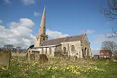 The parish church of St Peter dates back to approximately 1200, but the present fabric is from the 14th to 16th centuries, and was heavily restored in 1866 and 1896. It is constructed of limestone, greenstone and ironstone coursed rubble, with some limestone ashlar from the later restorations.[5] Declared redundant, it is now cared for by the Churches Conservation Trust.