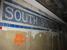South Station (also signed as South Station Under) is a transfer station on the MBTA rapid transit Red Line and bus rapid transit Silver Line, located at Summer Street and Atlantic Avenue in downtown Boston, Massachusetts. It is a part of the South Station complex, the second busiest transportation center in New England.[4] Eight MBTA Commuter Rail and three Amtrak intercity rail services terminate at South Station; many of those passengers then transfer to the rapid transit lines to reach other destinations in the city. With 24,639 daily boardings in 2019, South Station is the busiest station on the MBTA rapid transit system.[3]