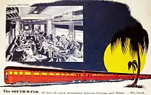 The South Wind was a named passenger train equipped and operated jointly by the Pennsylvania Railroad, the Louisville and Nashville Railroad, the Atlantic Coast Line Railroad (later Seaboard Coast Line), and the Florida East Coast Railway. The South Wind began operations in December 1940, providing streamliner service between Chicago, Illinois and Miami, Florida. This was one of three new seven-car, all-coach streamliners operating in coordination every third day along different routes between Chicago and Miami. The other two longest enduring Chicago-Florida trains were the City of Miami and the Dixie Flagler.[2] The South Wind remained in service through the creation of Amtrak in 1971.