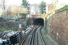The tunnel remained in use fulfilling its intended purpose until, in the 1960s, the invert (tunnel base) was found to be rising at one point.[4] Following this and concerns over ground movements in the vicinity of the tunnel extensive remedial work was undertaken between November 1964 and March 1965, with single line working through the tunnel allowing traffic to continue.[8] During this work the heading was reopened between the railway tunnel and the canal tunnel in 1965. This revealed that the brickwork within was still in good condition at that point, but that the tunnel was largely filled with rubble as reported in 1847.