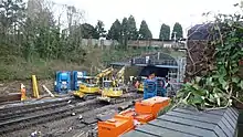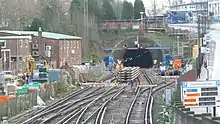 The remaining western section of the Canal Tunnel was drained and filled with flyash in the 1970s using shafts dug from the surface in order to stabilise the ground above.[4] Between 1983 and 1985, British Rail decided to perform extensive engineering works to facilitate the movement of larger containers through Southampton Tunnel. As part of these works, the railway through the tunnel was again operated as a single line and a narrow-gauge railway was constructed to convey mterials from the western end. As a result of this work three sections of the tunnel's interior were rebuilt with segmental steel linings, sealing off the canal tunnel heading again in the process.[10]