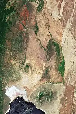 The river once flowed directly into the lake, but in geologically recent times it has been dammed by a horst beside the Shompole volcano. This has caused the waters to spread out into the steadily expanding Engare Ng'iro swamp, where the river deposits its sediment. The sediment-free river water then seeps into the brine lake.[5] The permanent swamp covers about 4,000 hectares (9,900 acres). South of this a seasonal floodplain of about 8,000 hectares (20,000 acres) stretches down to Lake Natron and along its eastern shore.[6]