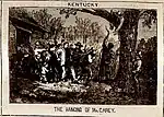 ![]() | "Kentucky: The Hanging of Mr. Carey" | "Feb. 19...the Journal's special correspondence says that a mob, composed of the remains of Quantrell's guerrillas, broke open Mr. Carey's house at Parkesville, and seized and hung Mr. Carey. He had been tried for stealing a horse to escape from the rebels at the battle of Perrysville." | |