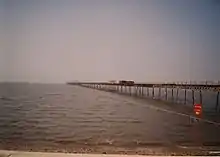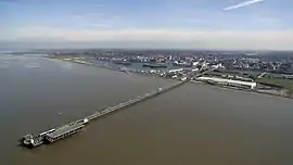 At 1,108 m (3,635 ft),[1] Southport Pier is the second longest in Great Britain.[lower-alpha 1][4] As a result of silting in the water channel, part of the pier now passes overland before reaching the beach, as the silt has allowed land beneath the pier to be reclaimed.[5] The entrance starts at Promenade Road and follows a route inland next to Princes Park, before crossing over Marine Drive and meeting the beach at approximately half-way along its length.