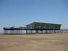 The pier today is an open structure, with modern railings on an older base and a deck made of hardwood slats, affording a partial view of the sea below.[23] Along the walkway are name plaques that local people funded to help towards raising the restoration funds.[24] The modern pavilion structure at the pier head was designed by Liverpool architects Shed KM and cost £1.2 million; the building houses a cafeteria with airport style floor to ceiling windows overlooking the beach[23] and a collection of vintage mechanical amusement machines and penny arcade. The exhibition of Edwardian and Victorian machines operates on pre-decimalisation pennies,[21] available to purchase on-site at £1 for 10 old pennies.[24]