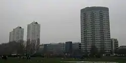 The site now occupied by the shopping centre was previously the Wandsworth Greyhound Stadium (which seated 20,000) and the Upper Mill (a large flour mill, damaged by fire in the 1920s and demolished in 1964).[8] The Arndale complex was designed to be relatively self-contained, with few connections to the surrounding shopping streets other than service and delivery entrances, and the value of the complex was increased by the construction of five high-rise blocks above the main shopping area, and the provision of over a thousand parking spaces in multistorey car parks. The complex included a health clinic and a day centre, as well as a post office. Because it was built over the River Wandle, it was considered something of an architectural and engineering achievement.[9] However, it was not universally popular, and its large size led to it being described by a contemporary commentator as "one of London’s great architectural disasters".[10]