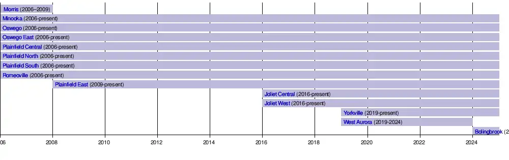 Joliet Central and Joliet West High Schools joined the conference from the Southwest Suburban Conference at the start of the 2016โ2017 school year, following a 2014 decision.[2] Both West Aurora High School, of the Upstate Eight Conference,[3] and Yorkville High School, of the former Northern Illinois Big 12 Conference,[4] were admitted to the SPC in 2018 and began conference play during the 2019โ20 school year.[5][6] In 2024, West Aurora High School will depart for the Upstate Eight Conference, with Bolingbrook High School replacing them.[7]