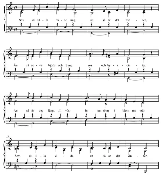 - Alice Tegnér's musical setting for the song was published in 1895 in the third booklet of the Sjung med oss, Mamma! ("Sing with us, Mama!") series, under the title Videvisan ("Willow song")[4] Tegnér adjusted the text slightly to fit her melody and modernized the spelling.[5] Tegnér's songs were reprinted in 1943 in the Nu ska vi sjunga ("Now we shall sing") anthology under the title Visor om djur och blommor ("Songs about animals and flowers").[6]