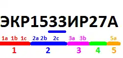 • 1a – Export designation: The letter Э (E) here indicates an integrated circuit intended for export with a pin spacing of 2.54mm (1/10") or 1.27mm (1/20"). If this element is empty then the device has the Soviet (metric) spacing of 2.5mm or 1.25mm between pins.