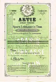 ![]() A 500 Swiss francs share of the Spar- und Leihkasse Thun (1912), 6th issue | |