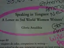 Speaking in Tongues: A Letter to 3rd World Women Writers is a letter written by Gloria E. Anzaldúa. The letter was drafted in 1979 and was published in Anzaldúa’s feminist anthology This Bridge Called My Back: Writings by Radical Women of Color (1981).[1] Writing this essay in the format of a letter, Anzaldua urges the reader to “write from the body” and she connects her body to other bodies, creating a community of embodied people.[2] This essay is addressed to women of color as she shows sympathy, encouragement, and words of wisdom towards them.[3] The essay addresses women of color and encourages these women to make their personal, embodied experiences visible in the text. The reader must also allow the text to enter herself, if the reader chooses to enter the text.[4]