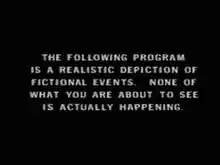 The filmmakers were required to include on-screen disclaimers at the beginning and end of every commercial break in order to assure viewers that the events were a dramatization. The word "dramatization" also appeared on the screen during key moments of the original broadcast. Additionally, WCIV placed the word "Fiction" on screen at all times during its showing of the movie. The film also made use of "accelerated time"—events said to take place hours apart instead are shown only minutes apart. In addition, NBC sent releases to the various military commands in the Charleston area of the movie's airing, so they could inform their attached servicemembers to be prepared for the possibility of nervous phone calls from home, and could reassure their relatives and friends back home that what was airing was in fact a fictional dramatization, and not a real news story. Nonetheless, there were still news reports of isolated panic in Charleston. Much as with the famous 1938 radio broadcast of The War of the Worlds, it was entirely possible for viewers to tune in between disclaimers and make a snap judgment about what they were seeing, although in both cases a quick flip of the dial would reveal that no other stations were covering this supposedly major news event. When the program was rebroadcast in 1984, the only disclaimers were made at the commercial breaks; there were none on the screen while the action was taking place.[3][4]