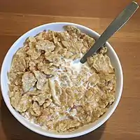 Special K is an American brand of breakfast cereal and meal bars originally manufactured by Kellogg's. The cereal was introduced to the United States in 1955.[1] It is made primarily from grains such as lightly toasted rice, wheat and barley. Special K used to be marketed primarily as a low-fat cereal that can be eaten to help one lose weight.[2] Following the 2023 spinoff of Kellogg's North American cereal division, the cereal is manufactured by WK Kellogg Co for the United States, Canada, and Caribbean markets. The former Kellogg's, renamed Kellanova, continues to manufacture the cereal for the rest of the world and the meal bars for all markets.