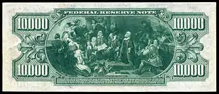 In 1837, Robert Walter Weir was commissioned by the United States Congress to paint an historical depiction of the Pilgrims. This painting was placed in the U.S. Capitol Rotunda at Washington, D.C. in December 1843. Known as The Embarkation of the Pilgrims, the 12 by 18 feet (3.7 by 5.5 m) painting is a scene on board Speedwell while harboured in Delfshaven, Holland. The historical event dramatized took place on 22 July 1620.[7] Weir would later paint another, much smaller oil on canvas that is now displayed in the Brooklyn Museum of Art. The paintings are similar except for lighting and a few minor changes. The 1857 work measures about 4 by 6 feet (1.2 by 1.8 m). The Embarkation of the Pilgrims is depicted on the reverse of the 10,000 dollar bill (Federal Reserve Note) issued in 1918.[8] Only five examples of this bill are known, and "none exist outside of institutional collections."