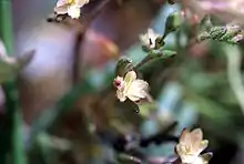 This is a plant of wet, often saline substrates, such as beaches, salt marshes, and brackish estuaries. It is an annual herb producing a slender or thick stem up to 25 centimeters long, which is lined with fleshy linear leaves up to 4.5 centimeters long. Flowers occur in an inflorescence at the end of the stem, as well as in leaf axils. The small flowers have five pointed sepals, and five oval white or pink petals. The fruit is a capsule containing shiny reddish brown seeds.