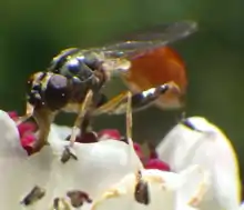 Sphegina rufiventris (Loew, 1863 ),[2] the Black-horned Pufftail, is a common species of syrphid fly observed in the northestern United States. Hoverflies can remain nearly motionless in flight. The adults are also known as flower flies for they are commonly found on flowers, from which they get both energy-giving nectar and protein-rich pollen. Larvae are found in accumulations of decaying sap under bark, usually in wet situations such as damp, shaded woodland and in partially submerged wood in streams and pools.[3][4][5]