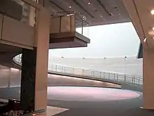 The defining feature of the building is a seemingly-floating spiral ramp (15 m in diameter) that encircles the rear gallery space and climbs to the second floor. The exterior facade of aluminum and glass reflects the jumbled nature of the surrounding streetscape.